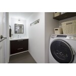 (旧東京ガスリモデリング株式会社での事例です。)洗面室の奥にあった細長く使いにくい納戸を撤去し、一部をご主人さまの書斎にしたことで、以前よりコンパクトながら使いやすくなった洗面所。鏡部分はタイルを貼って鏡をデザイン的に取り付けたかったので、水栓金具の位置などを検討し、ノーリツの洗面化粧台を取り付けました。完成後、鏡のまわりはご主人さまがタイルを貼り、まるで一幅の絵を飾っているようなデザインになりました。