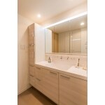 リビングダイニングとは隣り合わせながらキッチンとして間仕切られ、デッドスペースが多いL型キッチンが配置されていましたが、すべての仕切り壁を取り払いオープン型の対面式キッチンに改装。キッチンにいながらLDK・和室とすべてに目が配れるようになりました。 ウッドの感じがお好みとのことからいくつかの組わせ・パターンを提案した中で、最初に選んだフローリングのウォルナットを基調に天井にも木目のクロスを貼り、キッチンも淡い木目調としました。 また、リビング・ダイニング横にあった洋間を一つつぶしてリビングを広くし、アクセントで各所にエコカラットを配しました。