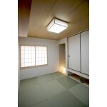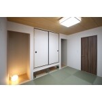 琉球畳風のヘリ無し半畳で施工させて頂きました。床の間のクロスは、和の雰囲気を出すために落ち着いた色合いの市松模様をチョイスしました。収納下部にあかりを取り込むための窓を設置しています。