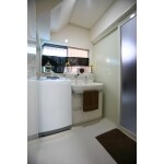 階段下の空間に収納を造作し、洗面化粧台と洗濯機を並べて置けるようにご提案しました。