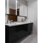 多くの小物を収納できるように、間口の広いミラーキャビネットを取付けました。 洗面台と洗濯機の間の壁を解体することで、使いやすく広く感じられるとご提案しました。