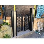外壁と同じく淡いグレーの門柱をブラックに塗装しました。 外壁に馴染んで重厚感のある印象に。