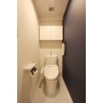 タオル掛けが取り付いている壁面には水ハネを考慮して、防汚機能のあるアクセントクロスを施工しました。またペーパーホルダーやタオル掛けは建具のハンドルや金物のサテンブラックと質感や色味を合わせてお選びいただきました。