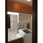 洗面台の上や洗濯機の上のスペースが空いていたので、キャビネットを取り付けて十分な収納スペースを確保しました。
