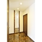 快適に過ごすためにこだわったのは広くすっきりとした空間。床は躯体の水平を整え、幅広のフローリングに。天井はダウンライトの必要寸法だけを残してできるだけ高く設定。2.5m以上の高さが取れました。温度差のある空気がよどまないよう、天井までの扉を特注。ウォークインクローゼットも通路として設定し、人の動きとともに常に空気が対流するように配慮しています。最薄のダウンライトと間接照明は、器具の存在感を見せずに柔らかい色の光だけを壁に当て、広範囲に使ったエコカラットの陰影を印象付けています。玄関には大理石を施し、その色に合わせた輸入のモザイクタイルを使用。不揃いの形、色を楽しむアートのようなスペースができました。家具以外何も出しておくことのないミニマムなスタイルは住まい全体に徹底され、上質な時を過ごされているそうです。