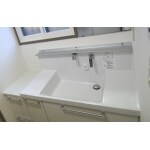 壁から壁へぴったり納まるように何点かご提案させて頂き、水栓や機能でTOTO サクアをご採用頂きました。 洗濯機廻りの改修もご提案させて頂き、デッドスペースへ収納も設けました。