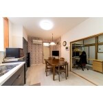 システムキッチンに変更して間口を狭め、家電収納・食器棚・ワインセラーを一列に置けるようにし、家事動線に配慮。 仕事場にしたいとご要望いただいた隣接する和室の床は、フローリングに変更し和室とDKの床にあった段差を将来のことも考慮し無くしてバリアフリー化。 和室だった部分の床を下げたため入口の襖も洋風な戸襖に変更、コンセプトはお施主様お気に入りのブルーのキッチンに合わせ色調を統一、壁一面のクロスはアクセントで柄物のクロスにしました。