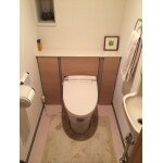 LIXILの「リフォレ」を採用していただきました。大規模なリフォーム工事も必要なく1日でトイレが変わります。 やさしい印象の木調扉で落ち着いたトイレ空間を演出致します。また、キャビネットのおかげでタンク廻りもすっきりしました。