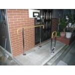 玄関から廊下に上がる段差を安全に行き来できるよう手すりを配置し、室外側はアプローチへの横移動を考えて手すりを配置しました。