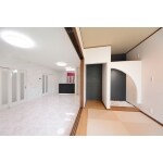 約20畳の大空間LDKとし、床はタイル調に。弊社設計士の方で某パチンコ店のトイレを実際に確認し、お客様のイメージを汲み取ったデザインでご提案しております。LDKの側面にある小上がりの仏間は、こだわりのある和室区間をイメージしております。