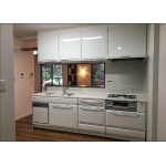システムキッチンは引出し収納式のもので締まったものも取り出しやすく、収納力のある商品をご提案しました。また、ホーロー素材なので、熱・衝撃・キズ・腐食にも強くなっています。キッチンパネルもホーロー素材でできており、マグネットでフックなどを取り付けることもできます。