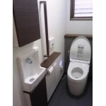 タンクレストイレにしてスッキリとさせ、便座は壁付けリモコンタイプにすると便座横の操作部がなくなり、掃除がラクになります。 収納については掃除道具収納タイプの手洗器をご提案しました。