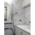 キレイサーモフロアなら水はけがよく、汚れの付きにくい床となっているのでお勧めです。また、こちらの商品(リノビオV)でしたら標準で浴槽が人造大理石となってますので、お手入れも簡単です。 ョールームで商品を決めていただきましたが、カタログではわからない商品の質感やサイズ、手触り等も体感していただけるのでショールームに行くことをお勧めしてます。 ショールームでお好きなオプションを追加していただいて今までと違った楕円のミラー、白いタイルのような壁パネルでとても広く、素敵な空間となりました。