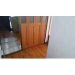 扉が邪魔にならないように、4枚扉のパーテーションをお薦めしました。 廊下の床は重ね貼りでご提案しました。