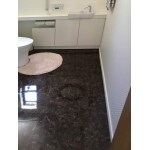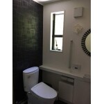 将来的に車椅子や介助者が入れるスペースを確保。 床材・壁材にこだわり、おしゃれなトイレ空間に。