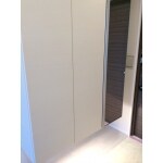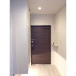 下駄箱下に照明を設置し、足元が明るくなりました。鏡付きなので、お出かけ前に全身をチェックできます。