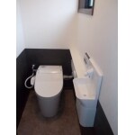 タンクレスのすっきりとしたトイレになりました。トイレの内装、壁紙をツートンにしておしゃれな空間としました。 リフォームでも間単に対応できる手洗い器も付いています。