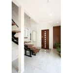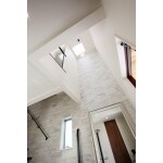 もともとはクロスでしたが、吹き抜け部分も全て、ホワイトとグレーの表情が豊かなタイルを貼りました。吹き抜けの天窓やリビングからの光がタイルの凹凸への陰影をつけ、立体感のある壁面となっています。