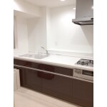 光沢のあるダークブランのキッチンは、上質感があります。ライン取手、レンジフードのデザインもスタイリッシュで、上部に収納を設置しないため、すっきりしたキッチンになりました。 キッチンパネルはお手入れしやすく、作業スペースも広くりました。