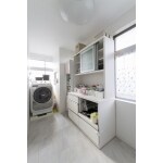 よくみられる日本の住まいとは異なるサニタリーは、トイレと洗面と浴室が同じ空間に。もちろん湿気を伴う浴室に扉はありますが、ガラス張りでオープンな雰囲気の浴室となりました。 壁付だったキッチンはL字のペニンシュラ・対面型になり、よくご両親のもとを訪れる娘さんたちと一緒に料理を作ったりホームパーティを開いたりとライフスタイルにあったものにいたしました。