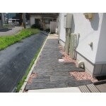 カフェをイメージしたお家とマッチするように、アーチをメインにデザインし、天然石の乱張りとインターロッキングの風合いを生かして、温かさも感じるお庭となりました。 家の廻りをインターロッキングで囲むことで、車椅子の方も自由にお庭を楽しめるようになりました。