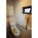 洗面脱衣室からトイレなので、なるべく広く空間を取るために、ドアを引き戸にしました。 ウォシュレット、壁リモコンの標準仕様をご提案させていただきました。
