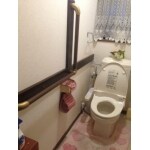 施工前のトイレ 便器に手摺はありますが、これだけでは不十分なので、壁面に取り付けます。