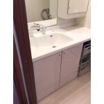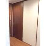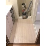 洗面台はそのまま、気になる水栓だけ交換しました。クロス・フロア―タイルも張替え、ダウンライトを増設し、明るい洗面室になりました。ドアは既存の開き戸を解体し、引戸を新設したことで、ドアを開いた状態でも邪魔にならなくなりました。