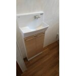 タンクレストイレでシンプルなデザインとなり、お掃除をラクにするため、「スキマレス設計」「有機ガラス系新素材」を採用。また、メラニン製のパネルを壁に貼ることで清掃性を高め、目地の汚れ掃除の心配もなくなりました。手洗い器の下も収納スペースを確保。