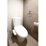 シックな柄のアクセントクロスと、スタイリッシュなデザインのペーパーホルダーやタオル掛けを採用して、落ち着いた大人っぽい空間になりました。