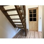 漆喰の白い壁と杉の無垢板、ブラウンの階段のコントラストが美しく、玄関周りが明るい印象になりました。反射率の高い漆喰の壁のおかげですね。