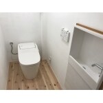 トイレの床も杉の無垢板です。壁はE様自ら塗装されました。美しく仕上がっていますね。トイレはパナソニックの”アラウーノS2”です。トイレはタンクレス、手洗い器は壁に埋め込み式で、スッキリ、清潔感あふれるさわやかな空間になりました。お掃除もしやすそうですね。