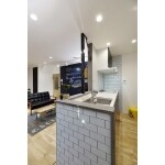 黒の鉄骨とサブウェイタイルで男前な印象のキッチン