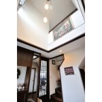 元の吹き抜けを活かしつつ白いクロスで広がりを感じられるようにしました