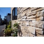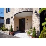 優しい風合いの塗り壁をベースにエッジの効いた荒めの石調タイルで仕上げて、理想の外観に。 塗り壁はひび割れに強い樹脂モルメッシュ工法で下地を作り、耐候性に優れたコレブサンドという塗料でフラットに仕上げました。