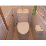 移動用の横手すりと便器からの立上り動作用の縦手すりを設置。壁を部分的に撤去し、手摺下地にベニヤ板を入れる事で補強用の板が無く、すっきりしました。