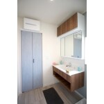 建具の色にパステルカラーを採用し、木目と淡いブルーで北欧風のかわいらしい洗面室に仕上げました。 洗面化粧台に使用したPanasonicのCLine(シーライン)は、リーズナブルにも関わらずフロートタイプでとてもオシャレ。質感も高いので大変オススメです。