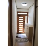 木目調のおしゃれで採光タイプの玄関扉です。玄関も明るくなりました。