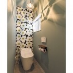 もちろん可能です。 奥様セレクトのフィンランドの輸入壁紙を取り寄せていただき、背面の壁に貼ってアクセントに。 天井や側面には、ケシの花模様の中にあるグリーンに近いシックな色の壁紙をコーディネート。 大胆な柄に使われている白・黒・グリーンと、トイレ・ペーパーホルダー・照明などの色がバランス良く配置され、空間に調和しています。 ムラのあるブラウンの床には、水に強いクッションフロアを貼りました。水滴や汚れても、サッと拭けてお手入れも簡単です。