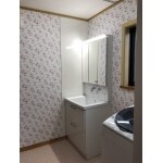 新規洗面台の横にキッチンパネルを貼ることにより、クロスの汚れ、カビ対策になります。 かわいいお花柄のクロスで、明るい洗面所になりました。