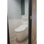 アラウーノVは手洗いタンクが付いていてもオシャレなデザインです。クロスの貼り分けで、可愛くコーディネートできたと思います。