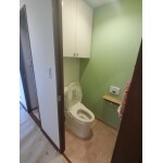 リビング側のトイレ。収納は十分。ありますので、便器の交換と、クロス、クッションフロアの貼り替えを行います。