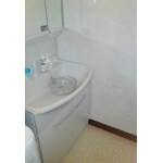 洗面台交換時に床を張替え横壁は水に耐性のある化粧パネルを張りました。今後は飛び跳ね汚れも心配なく利用して頂けます。
