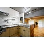 子育てがしやすい様にと間取りを見直して配慮したのは、奥さまがキッチンにいてもお子さまを見守りやすい状態である事。奥まったところにある壁付I型キッチンをL型の対面キッチンに替え、リビングダイニング側を開放。一部に壁と窓を設け、中が見えすぎないよう配慮し通風を確保しました。南面の2室をつなげて広いリビングダイニングを造り、上階の配管が走る天井は組みなおして防音性と断熱性を向上。壁は漆喰に、床は天然塗料で仕上げた無垢材で造り、お子さまものびのび遊べる心地よい空間としました。