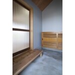 玄関は土間のスペースを広く取りました。ブルーグレーがすっきりした印象を与えてくれます。 玄関収納は既存の収納を使用しました。 新しい玄関にもマッチしています。