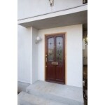 植木と雑草が生い茂り、何となく暗い雰囲気の玄関ドア。玄関廻りのタイルも古びていました。