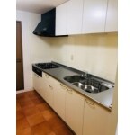 とてもシンプルな仕様のシステムキッチン。横幅2700と大きなキッチンとなっています。壁・天井のクロス張替えと床のクッションフロアも張り替えて、リフレッシュです。