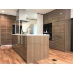扉のカラーはシェードブラウンです。カップボードも同じ柄でコーディネートし天井まで高さを持たせたことで、統一感と空間に広がりを感じます。収納力抜群です。こちらのカップボードには、ナノイー搭載の食品庫や収納棚を目の高さまで降ろして物の出し入れができる”ソフトダウンウォールユニット”も設置しました。