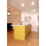 段差の多い天井が目立たないよう、フード・パネル・壁クロスを全てホワイトで統一し、照明は視覚的にも美しいダウンライトでスッキリと納めました。 イエローとホワイトのコントラストがキュートな、明るく開放的なキッチンへと生まれ変わりました。