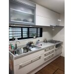 L社のシステムキッチンの中でも上位グレードのリシェルを設置致しました。自動で下りてくるウォールキャビネットは物が取りやすく、側面には収納・作業スペースが存分にある収納フロアをドンと設置しました。 また、リビングとの仕切りを作り直し、開放的な空間に生まれ変わりました。